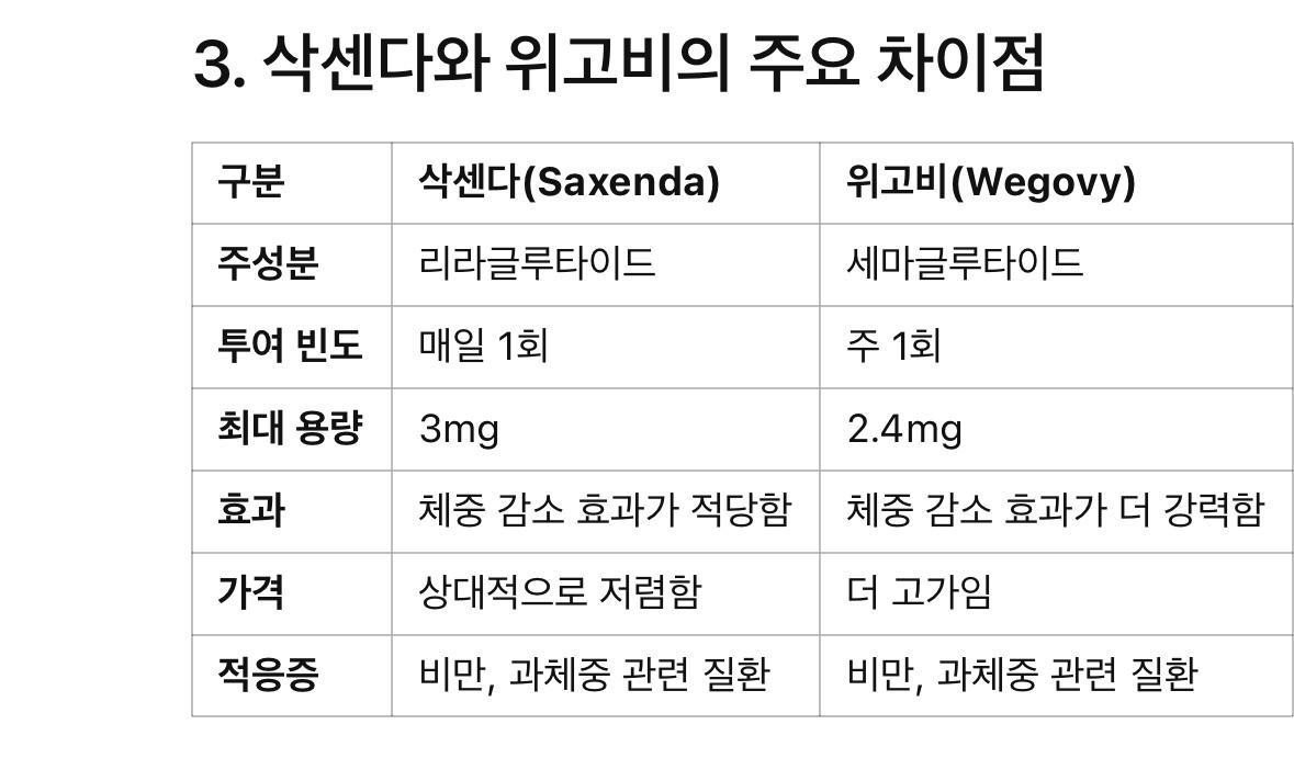 ์‚ญ์„ผ๋‹ค(Saxenda)์™€ ์œ„๊ณ ๋น„(Wegovy)๋Š” ๋ชจ๋‘ ์ฒด์ค‘ ๊ฐ์†Œ๋ฅผ ๋ชฉ์ ์œผ๋กœ ์‚ฌ์šฉ๋˜๋Š” ์ฃผ์‚ฌ์ œ์ž…๋‹ˆ๋‹ค. ๋‘ ์•ฝ๋ฌผ์˜ ์ฃผ์„ฑ๋ถ„์€ ๋ฆฌ๋ผ๊ธ€๋ฃจํƒ€์ด๋“œ(liraglutide)์™€ ์„ธ๋งˆ๊ธ€๋ฃจํƒ€์ด๋“œ(semaglutide)๋กœ, GLP-1(๊ธ€๋ฃจ์นด๊ณค ์œ ์‚ฌ ํŽฉํƒ€์ด๋“œ-1) ์œ ์‚ฌ์ฒด์ž…๋‹ˆ๋‹ค. ๊ทธ๋Ÿฌ๋‚˜ ์ด ๋‘ ์•ฝ๋ฌผ์€ ์šฉ๋Ÿ‰๊ณผ ์ ์šฉ ๋ฐฉ์‹, ํšจ๊ณผ์—์„œ ์ฐจ์ด๊ฐ€ ์žˆ์Šต๋‹ˆ๋‹ค. ์•„๋ž˜์—์„œ ๋‘ ์•ฝ๋ฌผ์˜ ํšจ๋Šฅ, ์ฐจ์ด์ , ๋ถ€์ž‘์šฉ์„ ์ž์„ธํžˆ ์„ค๋ช…ํ•˜๊ฒ ์Šต๋‹ˆ๋‹ค.