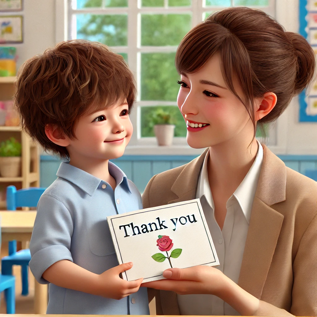 μ„ μƒλ‹˜, μ•ˆλ…•ν•˜μ„Έμš”! μ € [아이 이름]μ˜ˆμš”. μ„ μƒλ‹˜ 덕뢄에 μœ μΉ˜μ›μ—μ„œ 즐겁고 ν–‰λ³΅ν•œ μ‹œκ°„μ„ 보낼 수 μžˆμ—ˆμ–΄μš”.