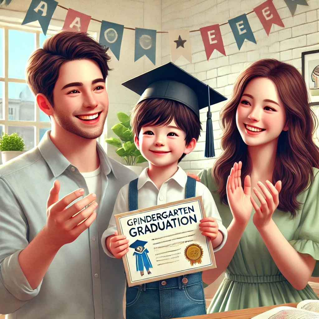 μ—„λ§ˆ, μ•„λΉ ! μ € μœ μΉ˜μ› μ‘Έμ—…ν–ˆμ–΄μš”! 처음 μœ μΉ˜μ›μ— 갔을 λ•Œ 많이 λ–¨λ ΈλŠ”λ°, μ—„λ§ˆ μ•„λΉ κ°€ 응원해 μ€˜μ„œ μΉœκ΅¬λ“€λ„ 많이 사귀고 재미있게 놀 수 μžˆμ—ˆμ–΄μš”.