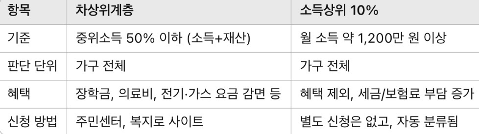 μ°¨μƒμœ„κ³„μΈ΅ κΈ°μ€€,ν˜œνƒ,신청방법,μ†Œλ“μƒμœ„ 10%,μž¬μ‚°, 2025λ…„ 6μ›” κΈ°μ€€μœΌλ‘œ μ‰½κ²Œ μ •λ¦¬ν•΄λ“œλ¦΄κ²Œμš”