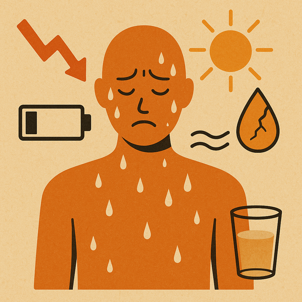 โ€ข ํ”ผ๋กœ๊ฐ, ๋ฌด๊ธฐ๋ ฅ, ๋•€์„ ๋งŽ์ด ํ˜๋ฆฌ๊ณ  ํƒˆ์ˆ˜ ์ฆ์ƒ