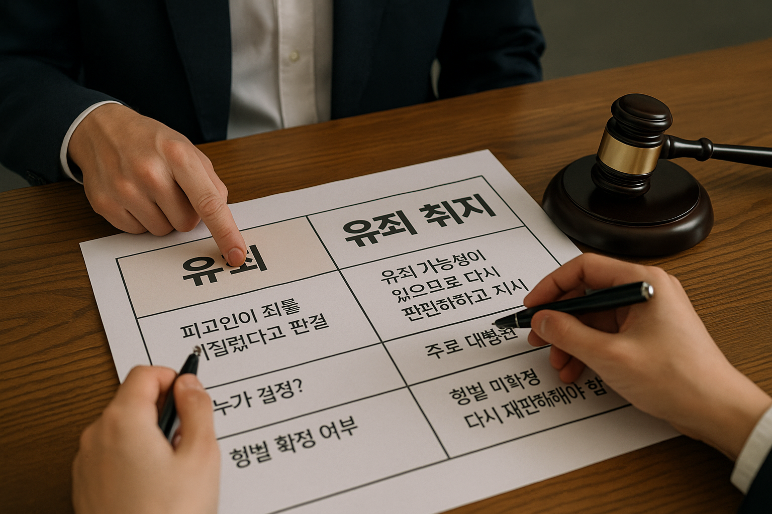 μ½κ² λ§ν΄, λλ²μμμ νκΈμ¬μ λ¬΄μ£ νκ²°μ λ¬Έμ κ° μλ€κ³ νλ¨νλ©΄, βμ μ£λ‘ νλ¨ν΄μΌ ν κ² κ°μΌλ λ€μ μ¬ννμΈμβλΌλ μλ―Έλ‘ μ¬κ±΄μ νκΈ°νμ‘ν μ μμ΄μ. μ΄λ μ¬μ©νλ ννμ΄ λ°λ‘ βμ μ£ μ·¨μ§λ‘ νκΈ°νμ‘βμ